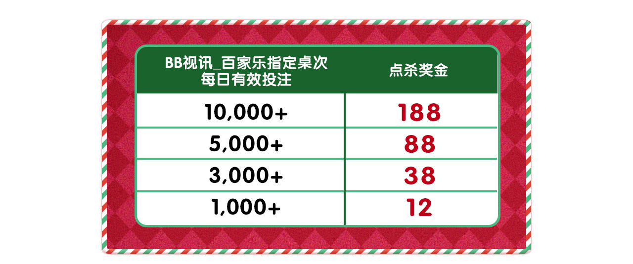 : P( @$ p- R  X* c/ V# ]凡会员于BB视讯_百家乐指定桌次_每日投注达1,000元以上,出现最终结果以「一点之差获胜」的情况,即有机会获得最高奖金188元。