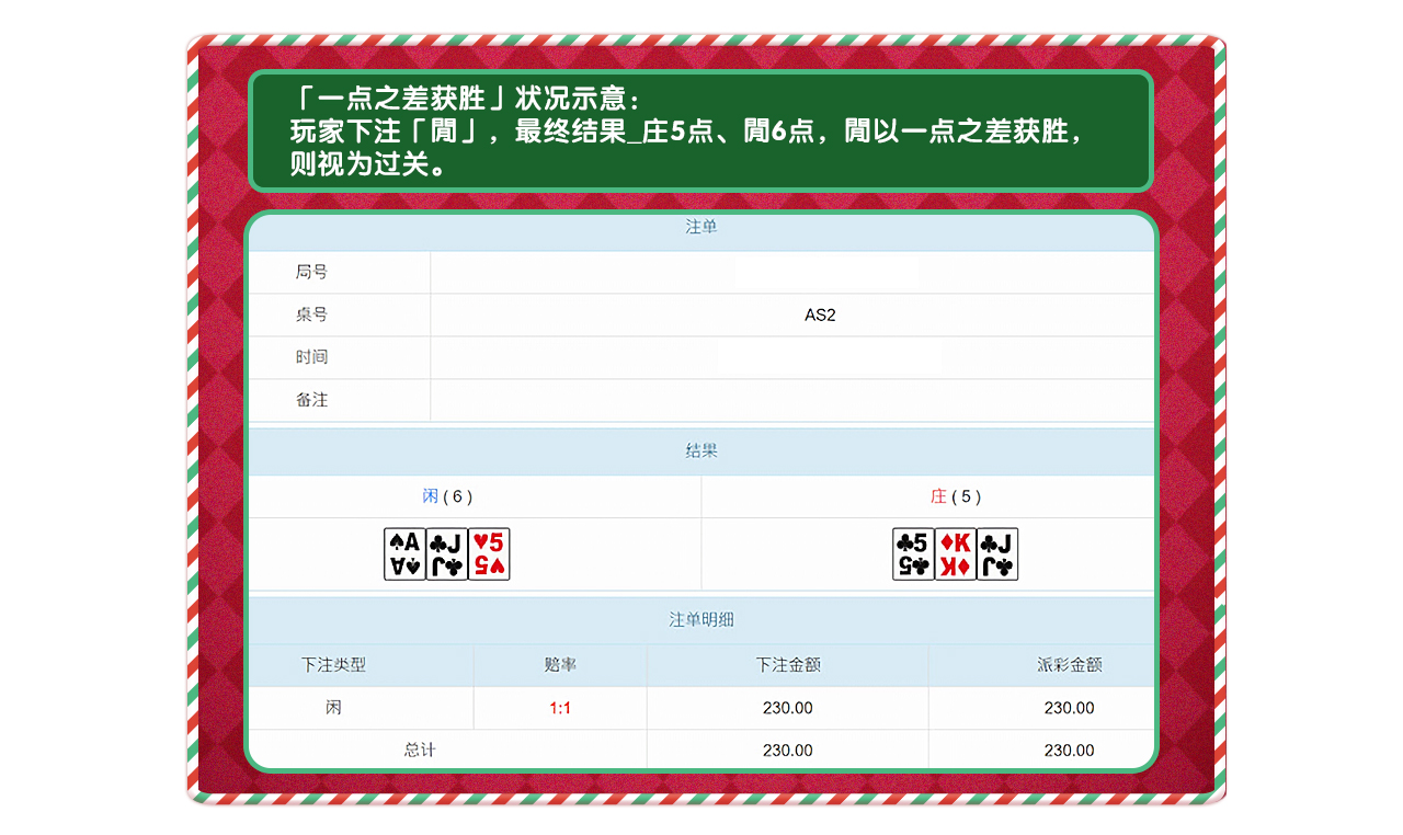 * S) H7 m" `8 \3 \# G' [2 B& c玩家下注「闲」,最终结果_庄5点、闲6点,闲以一点之差获胜,则视为过关。