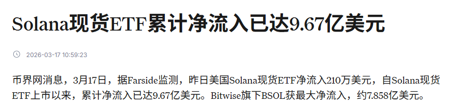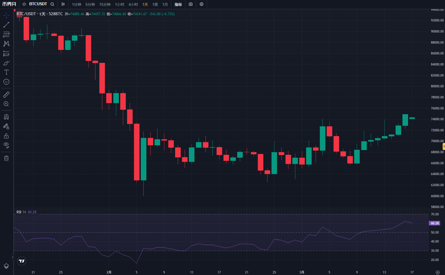 比特币的价格在过去一周表现出色,成为今年以来最亮眼的表现之一。从上周一到现在,可以很明显看到比特币经历了连续8天的收阳行情,而这样的行情在当前的周期中相当难得。同时,这也是自2025年10月以来最长的连涨纪录。 比特币的这一波“八连阳”行情,直接其价格从66,000美元附近推升至一度触及76,000美元的高点,创下了过去六周以来的最高价格纪录。 虽然,比特币的价格上涨幅度并不像其他资产那样引起全球金融市场的轰动,但它的走势却展现出了一种稳步上涨的态势。这就像是跨越一条小溪,每一步都在不断突破前一个高点,同时也抬高了底部的支撑,形成了更高的高点和更高的低点。这种有序的上涨反映出比特币市场信心的逐步增强。 以太坊单日涨幅11.72%不仅如此,山寨币的龙头以太坊在昨日展现出了超越比特币的强劲爆发力!当天,以太坊的价格从约2060美元附近开始发力,一路上涨,最终在晚上12点收盘时触及2300美元,单日最高涨幅一度超过了11%。 尽管以太坊的价格距离历史最高点还有很长的一段差距,但以太坊已经创下了自2月份因全球宏观地缘ZZ波动而导致市场回调以来的最高收盘价。 此外,昨日以太坊的日交易额激增至约187亿美元,达到了过去14天平均水平的2倍左右。这一变化也直接反映出全球资金在比特币市场趋于稳定时,开始缓慢流入以太坊生态中。 不仅如此,就在昨日,Bitmine等大型加密资产持有机构公开宣布将加速增持以太坊! 事实上,自3月份以来,Bitmine就已经增持了超过11.1万枚以太坊,使其持有量现已占到以太坊总供应量的3.75%以上。而这种机构级别的资本宣布将加大资金、提快增持速度,无疑是大大提振了市场对以太坊补涨前景的信心。 目前,全球共有67家企业持有以太坊,总持有量为727万枚,价值高达151.1亿美元,约占以太坊总供应量的6.01%。而在其中,Bitmine的持有量占据了这一份额的一半以上,使其成为最大的机构持有者。 加密货币总市值重回2.5万亿美元而在另外一方面,今年加密货币市场受到全球宏观ZZ环境风险加剧的影响,导致整个市场出现了剧烈的回调,在2月初时,加密市场的总市值曾一度跌破了2.15万亿美元。但是,目前该市场的总市值已经重新回升至2.5万亿美元以上,也就意味着在短短两周时间里,收复了近4,500亿美元的市值。 加密货币现货ETF近期表现本轮加密货币市场的总市值的增长回升,与以往单纯由情绪推动的上涨不同。当前,全球金融市场仍然处于美伊战争以及能源供应中断的背景下,风险偏好情绪依然受到地缘冲突的影响,市场情绪仍处于恐慌状态。 因此,该市场的这一波市值增长最核心的催化剂,正是近期加密货币现货ETF的大规模资金净流入。也可以说,华尔街对加密货币市场的信心逐渐恢复。 比特币现货ETF从3月份以来,华尔街的比特币现货ETF流入情况表现出乎意料!在过去11个美国比特币现货ETF的交易日中,仅有2个交易日是出现了大规模资金的净流出,而其余交易日则普遍出现了大规模资金的净流入。 根据币界网最新的数据统计,从3月2日到现在,华尔街的比特币现货ETF净流入资金规模合计已超14.2亿美元! 以太坊现货ETF而在华尔街的以太坊现货ETF资金流入情况中,可以很明显可以看出,该现货ETF已经连续5个交易日实现了资金的净买入,合计净流入资金高达1.722亿美元。也显示出,华尔街机构对以太坊的购买兴趣在日益增加。 Solana现货ETF根据币界网的最新报道,截至目前,Solana现货ETF在2025年10月成功通过获批上市以来,该现货ETF的累计净流入资金已高达9.67亿美元。 并且,Solana现货ETF已经连续5个月实现了华尔街资金的净流入,展现出惊人的表现。 结语尽管加密货币市场的市值回升势头良好,但考虑到本周处于美联储利率决议的窗口期,市值在2.5万亿美元这一关口可能会出现剧烈波动。目前,全球市场的焦点正集中在美联储对2026年后续降息的指引,以评估对全球金融市场的影响。 比特币正试图站稳长期以来的74,000美元至74,500美元这一关键阻力区间。如果能够实现日线级别的有效突破,则比特币将有望突破至80,000美元的心理关键目标价位。 免责声明:请读者严格遵守所在地法律法规,本文内容基于市场公开资料整理仅供参考,不构成任何投资建议。 / v0 H" T, g' O7 B